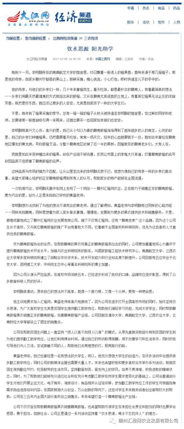 (2)江西省門戶網站:本公司引進了中國江西新聞網、大江網等江西省門戶網站的關注,并在首頁對我公司發(fā)展歷程、銷售情況、助農助學等事跡進行報道。